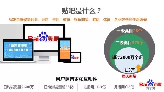本节课主要从三个大方面来给大家介绍下百度贴吧这款产品:百度贴吧的背景情况、贴吧的优质资源、贴吧的案例。 百度贴吧背景 百度贴吧,是百度旗下独立的品牌,全球最大的中文社区。结合搜索引擎建立一个在线的交流平台,让那些对同一个话题感兴趣的人们聚集在一起,方便地展开交流和互相帮助。贴吧实际是一种基于关键词的主题交流社区,它与搜索紧密结合,准确把握用户的需求,为兴趣而生。