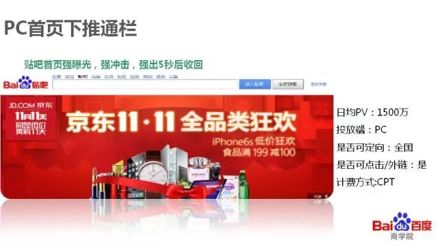 下面这个是京东在双十一时候做的广告形式,打开百度贴吧首页,就能够看到京东双十一全品类狂欢,品牌强势曝光,起到了很好的视觉冲击,这种样式呢强出5秒后收回,非常吸引网民的眼球。日曝光量1500万左右,投放端是在PC端,可以全国定向投放,可以点击也可以外链,计费方式是CPT,包段购买。