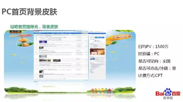 第2种形式是PC端首页背景皮肤,我们可以看到这是美汁源的广告形式,采用的是背景皮肤的样式,以蓝色系为主,很好的吸引用户的眼球。