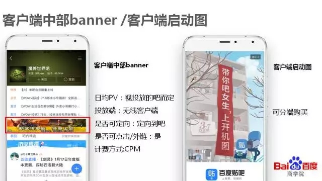 第5种形式是客户端吧内页面中部banner,也就是在网民的客户端,中间的位置可以进行广告的投放,日曝光量要根据你投放的吧而定,投放端在无线端,可以定向到吧来投放,可以点击也可以外链,计费方式是CPM。同样在客户端也有启动图的样式,刚打开贴吧的APP能看到广告。