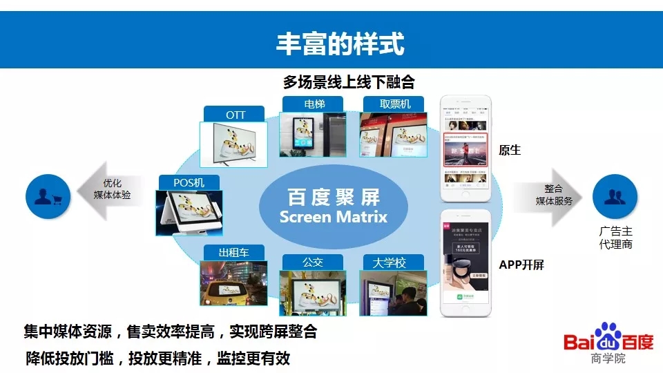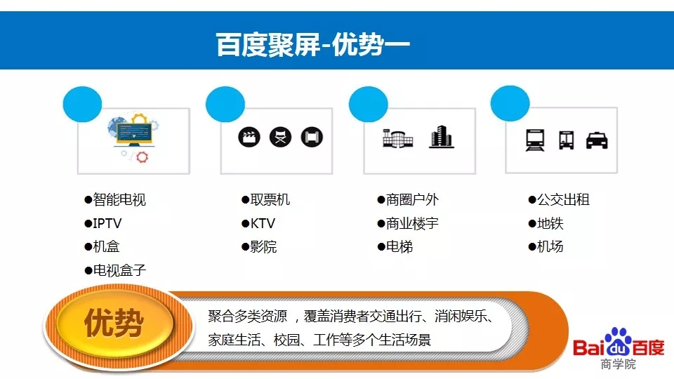 百度聚屏通过线上广告和线下场景(智能电视、公交车、出租车、地铁等)紧密结合的形式,更加深入地将广告和场景结合起来,为广告提供更丰富更有效的载体,为用户提供更有价值的信息。同时也可以为百度联盟挖掘全新的流量类型,扩充联盟流量,巩固联盟业务领先地位,进一步抢夺市场份额。