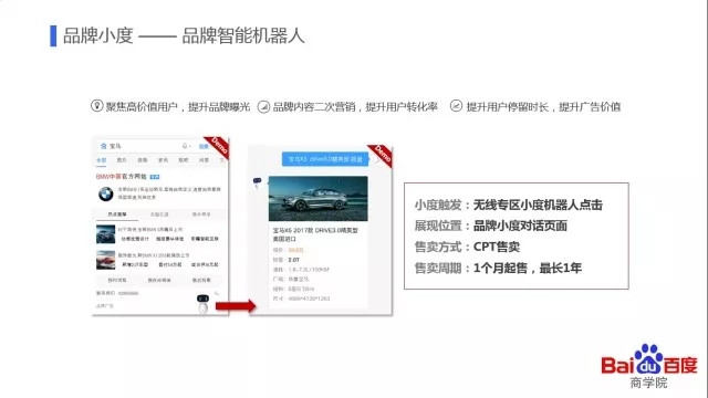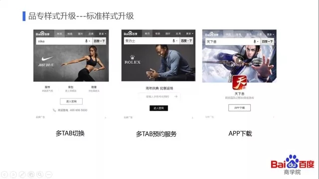 一直以来,百度品牌专区都以他独特的优势,在为企业主的品牌树立与提高品牌影响力上,做出了很多贡献。 而在互联网广告市场飞速变化的今天,百度品牌专区同样顺势而为,推出了诸多符合大众审美以及科技发展趋势的新样式,让我们的品牌影响力更胜一筹。 百度品牌专区为什么要升级新样式? 现如今,品牌广告不断推陈出新,各大搜索引擎都更新了品牌产品样式,在原有基础上,优化了视觉体验。微信强体验式(短视频)+ 创意落地页的品牌广告形式,让大量广告主趋之若鹜。 现如今,传统搜索凤巢产品,也在一直在升级、突破。虽然在产品侧,品专产品的面积比凤巢大,但是部分标准品专样式与这些凤巢新样式间,没有明确界限。 为了提高百度品牌专区的吸引力与优势,所以针对样式,我们做了升级提升。 百度品牌专区升级后样式介绍 品牌专区样式升级分两个方向: 1、现有品专样式的更新升级。满足在搜索结果的展示类需求,并提供更高规格的展示和功能服务。 2、全新的创新品专样式。提供按需定制服务,更多人机交互、界面交互,以及AR类的创意功能。 首先让我们来看下标准样式升级后的示例: 1、多TAB切换:对服务导流、客服电话需求较高的可以选择。 2、多TAB预约服务:对销售线索有需求的客户可以选择这种。 3、 APP下载:核心需求为App下载的客户可以选择这种。 除了这三种之外,标准样式还有很多升级样式,这里就不一一介绍了。 接下来我们来看下,其他的定制化样式。 AR品专,是基于百度技术最前沿的AR深度实验室,量身打造的创新广告。使用AR全息广告的视觉盛宴,让品专广告更生动的呈现出来。网民可以通过场景扫描,完成互动。 还有AR视频样式。能够让视频播放,更加生动有趣。而其中的视频、图片、链接,全部都可以自行设计,满足不同需求。 除此之外,还有很多的特殊AR样式,并支持定制化设计。 而针对无线端的特点,无线品专现在还有品牌小度这个智能机器人,提高转化率。 品牌小度是品专引入页面应用深度学习技术,支持品牌智能机器人(小度)与用户多轮知识问答交互的服务。 他拥有以下的优势: 1、聚焦高价值用户,提升品牌曝光。 2、品牌内容二次营销,提升用户转化率。 3、提升用户停留时长,提升广告价值。 品牌小度能深度洞察用户意图,主动完成与客户的沟通,提供内容和服务的完整体验。 以汽车行业为例: 用户先问『宝马X5价格』。 在获取答案之后又问『那X6呢』。 小度能自动补全成『宝马X6价格』并进行回答。 百度品牌专区新物料制作规范 为了提高网民体验感,新样式有着新的物料制作规范。 1、头图布局: Logo和元素区域比例为1:2。 布局形式:logo在左,元素在右。 主体元素:单体元素需要清晰且突出;若需要出现多个元素,元素集中展示的同时,排列需有主次,保证头图有视觉焦点。 2、头图颜色: 若头图背景色为白色时,Tab与搜索框下面需要叠加渐变灰色层,保证Tab与搜索框能与头图明显区分,视觉清晰。 若头图背景色为彩色时,Tab与搜索框下面叠加的渐变层,需与头图背景使用同一色系的较深颜色。 头图背景需要使用大面积色块或简单底纹,要与主体元素色彩明显区分,保证头图干净简洁,有视觉焦点。 头图Logo的颜色如果超过3个色系,则使用反白或反黑的样式。 3、头图风格及质量: 头像元素使用实物风格来展现,不能使用扁平化、矢量化等非实物展现。 使用图片需保证高清,压缩过程中不得过渡损失图片质量,从视觉上控制JPG产生的噪点和层次感的丧失。