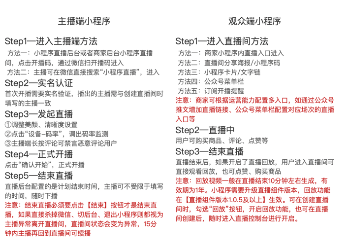 2、操作流程:直播间创建、直播间商品管理、直播间控制台查看、主播码、分享小程序码、直播间管理、直播订单的导出等需要商家在小程序后台和商家后台分别操作。具体如下表