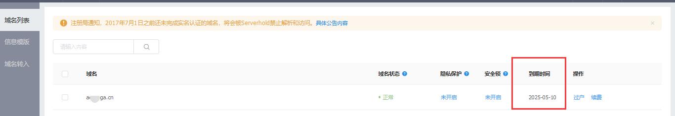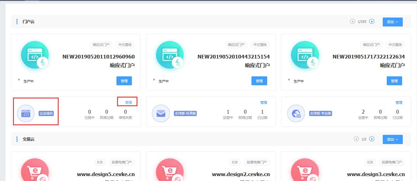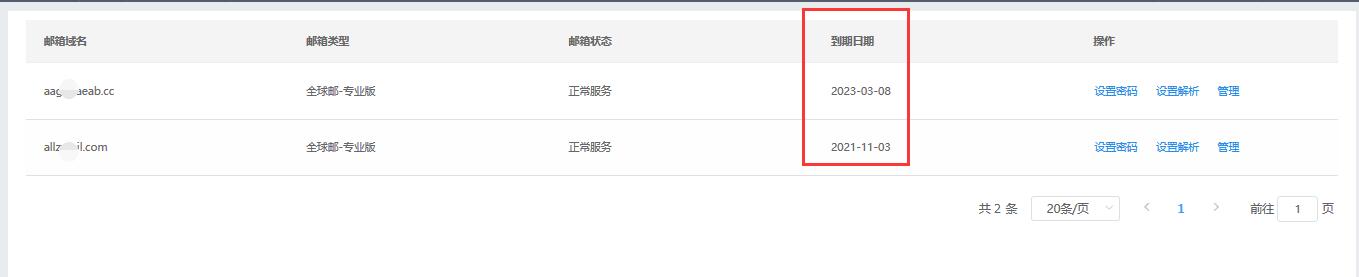 点击【企业域名】右上方的管理,进入后可查看域名到期时间