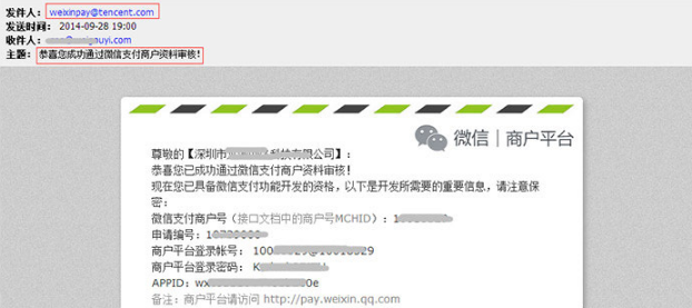 第一阶段完成后,会收到weixinpay@tencent.com的通知邮件,如下图所示