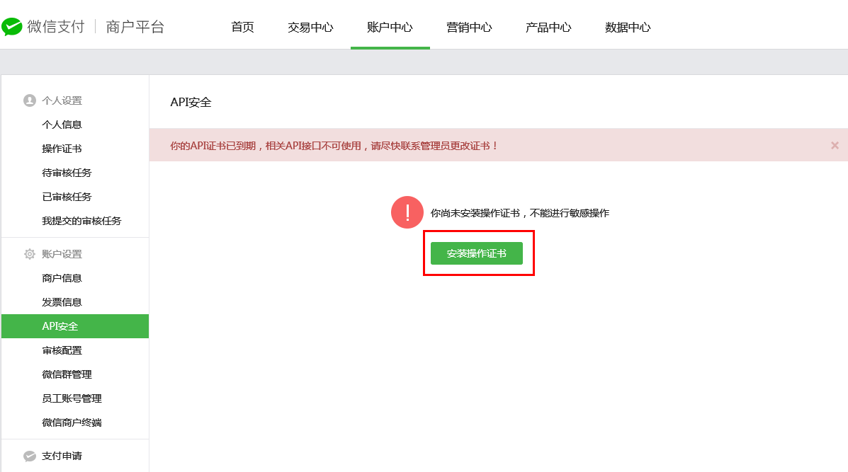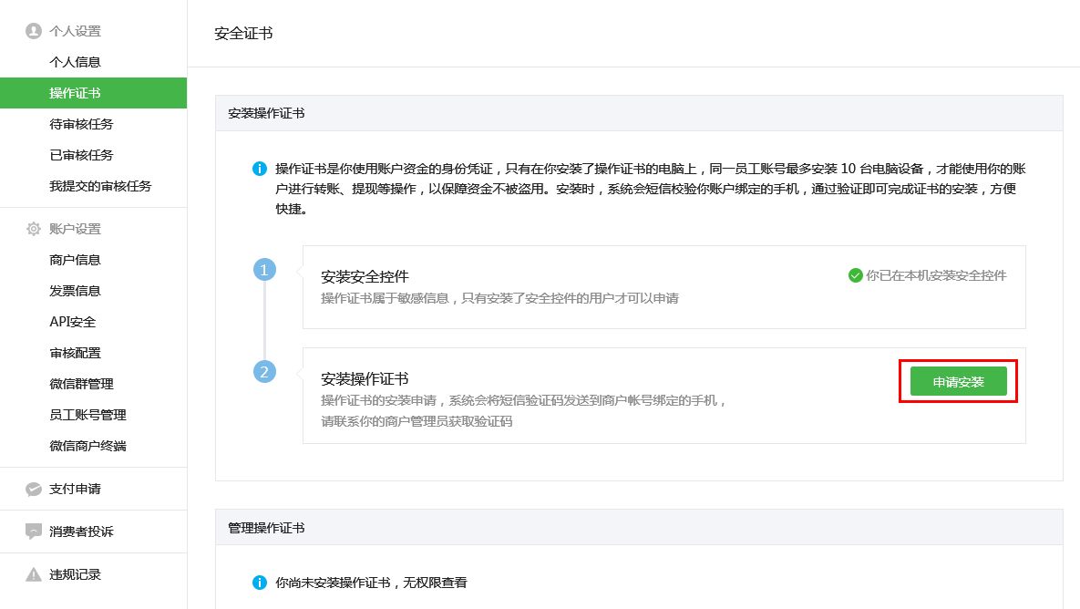 1) 使用通知邮件中提供的初始账号、密码登录商户平台,登录后先安装操作证书,安装过程会验证商户账号绑定的手机短信。