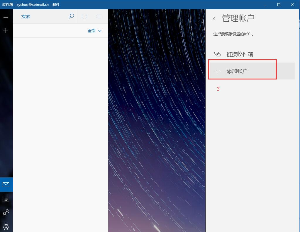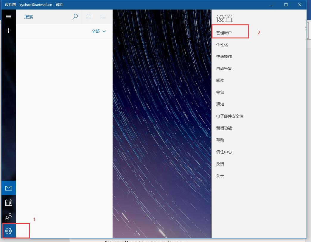 1、打开WIN10的MAIL应用:点选工具图1步骤,点击管理账户。