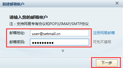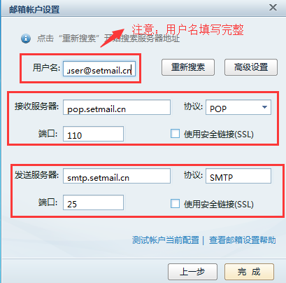 第二步,填写服务器地址信息,填写用户名信息,注意“用户名一定要填写完整,例如user@setmail.cn”