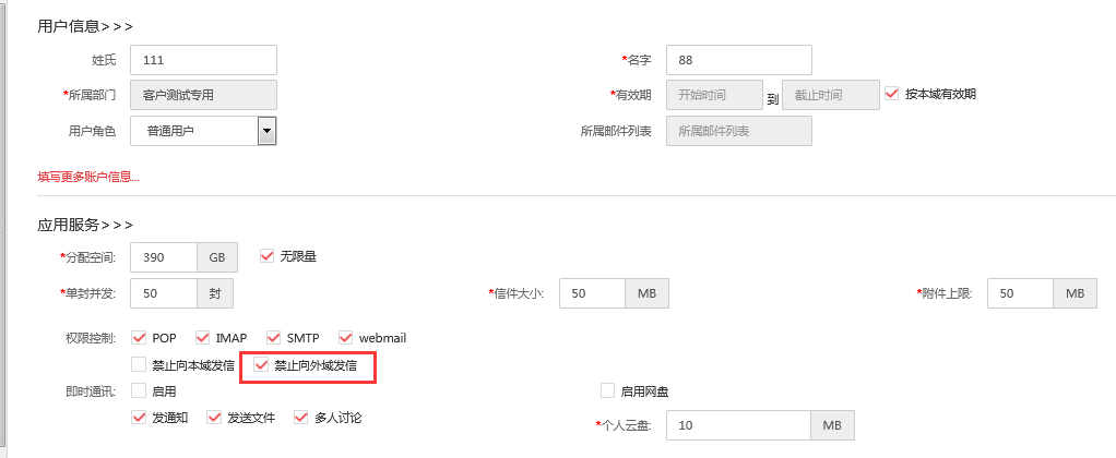登陆管理员账号——点击账号管理——修改账号信息——勾选“禁止向外域发信”,点击保存。