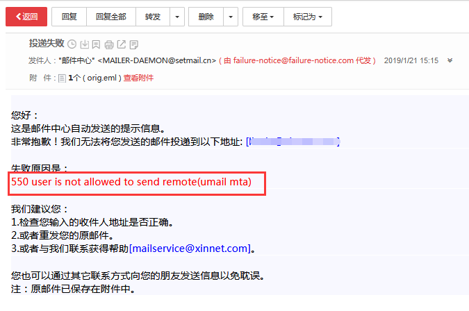 开启限制后,如给外域发信系统会返回退信,如下。