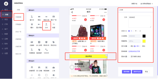 操作路径:微商城电脑端后台-店铺–页面管理–新建页面或编辑页面-添加“文本”组件: