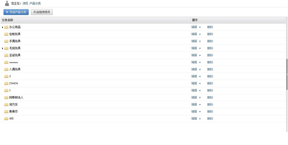 点击产品分类列表中的【编辑】链接,弹出编辑分类窗口,修改分类信息保存即可。