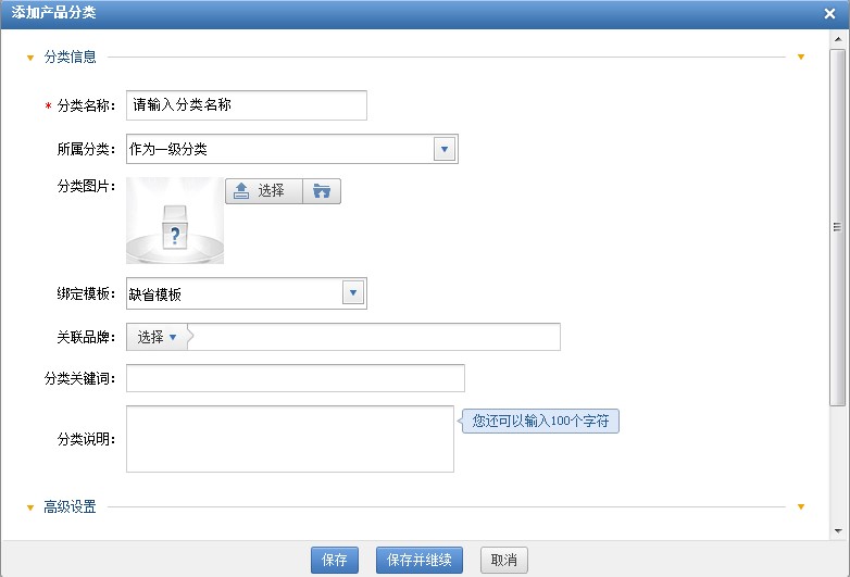 1)点击【添加产品分类】按钮,填写分类信息、高级设置、推广优化、权限设置信息后点击【保存】保存。