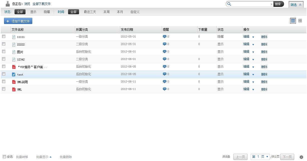 2、点击【内容】-【下载】-【全部下载文件】,进入全部下载文件列表页面,全部下载文件提供两种视图:表格视图、图示视图,默认显示表格视图。