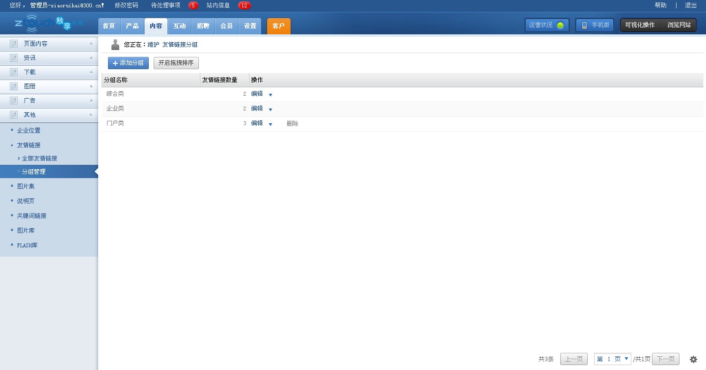 2、点击【内容】-【其他】-【友情链接】—【分组管理】,进入到分组管理页面。在此页面可维护友情链接分组。
