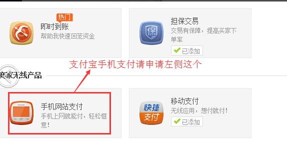 3.您的支付宝申请类型错误,我司产品支付宝手机支付接口为左侧的【手机网站支付】,而不是右侧的【移动支付】