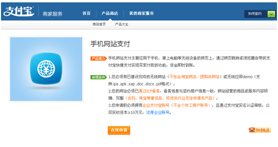 6、点击【手机网站支付】,进入【手机网站支付申请】页,点【在线申请】。